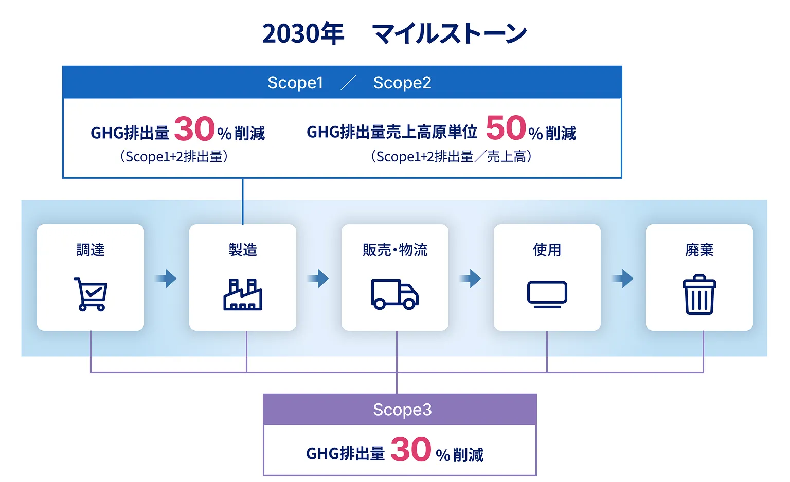 当社は、持続可能な地球環境の実現に向け、2050年でのカーボン・ネットゼロを目指しています。そのために、下図のようなマイルストーンを設定し、活動しています。