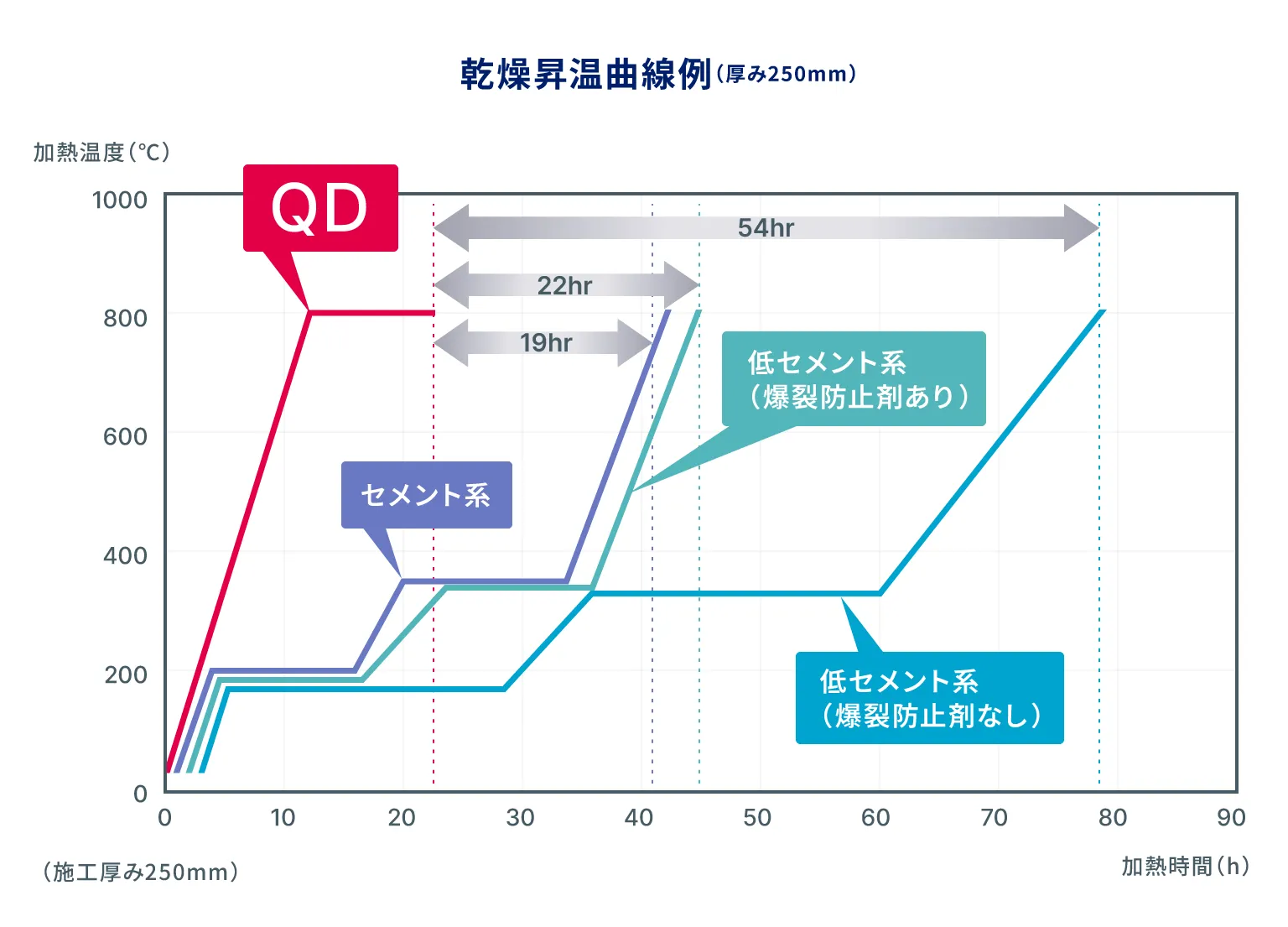 耐爆裂性に優れているため急速昇温が可能で、乾燥時間短縮により工期短縮メリットを最大化させることができます。