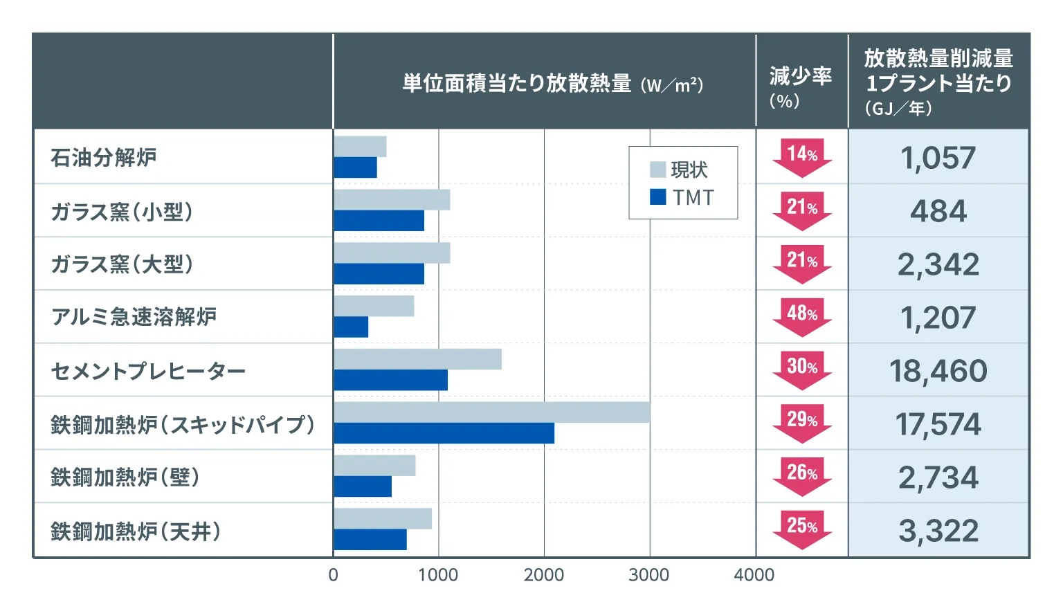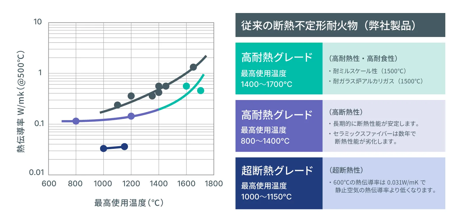 「TMT」は、従来の断熱不定形耐火物製品と比較して大幅に断熱性が向上