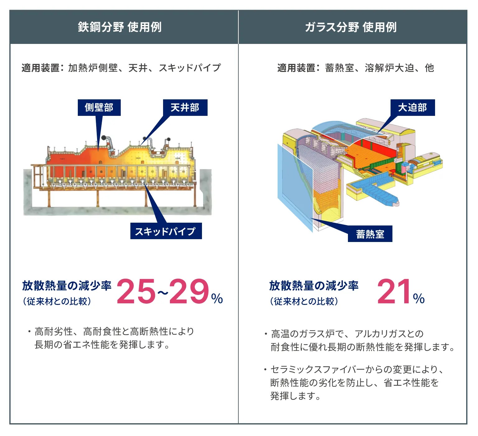 セラミックスファイバーと同等の高い断熱性を持ち、各種工業炉の省エネルギー化に貢献します。リフラクトリーセラミックスファイバー(RCF)を一切含まずに高度な省エネ性能を実現します。