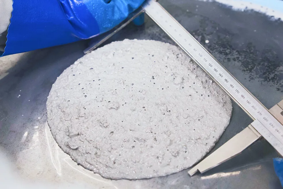 製品粉体を規定水量で混練し、添加水量、可使・硬化時間などを検査し、施工性の評価を行っています。