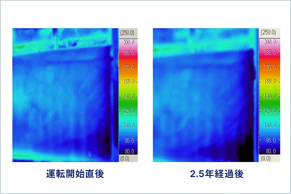 サーモビュアーを用いて設備外側の温度分布を測定し、当社耐火物の使用による放散熱量削減や省エネ効果を検証します。