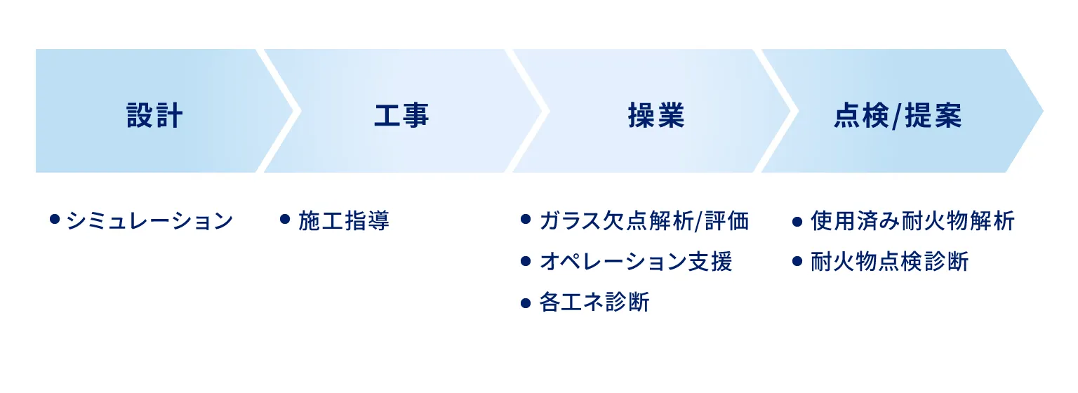 また、お客様のご要望に応じて、使用済み耐火物解析と組み合わせて、設備の安全性と効率向上をサポートします。